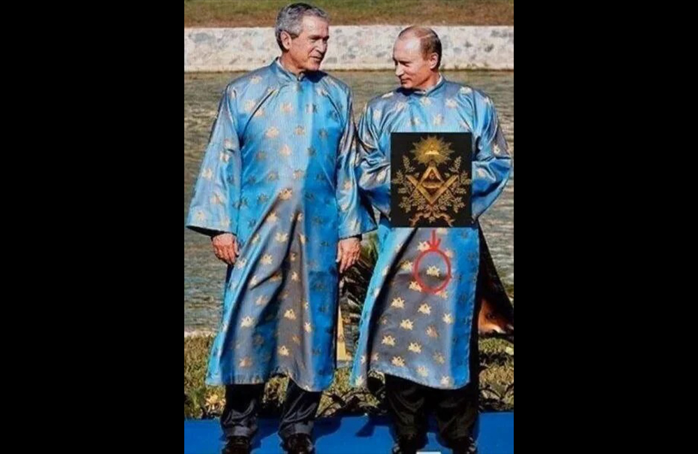 Udawany zbawca George Bush i Wladimir Putin w togach masońskich. Gdyby ktoś jeszcze wierzył, że na górze nie ma wspólnych szefów. typex.info 19 sierpnia 2025